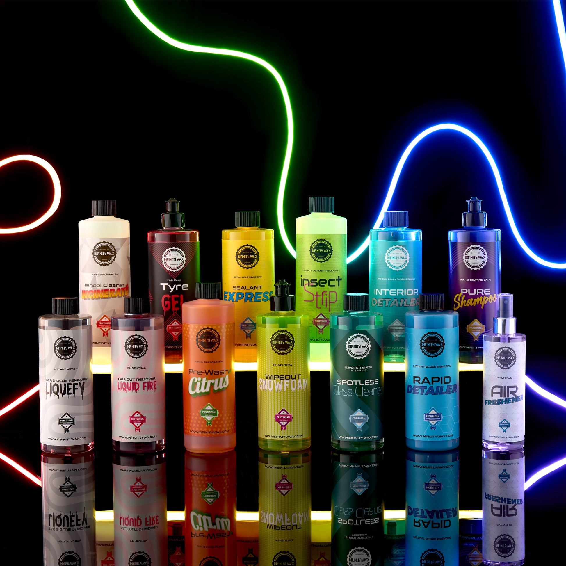 - Liquid Fire (fallout remover) - As the name suggests, this stuff packs a real punch! Designed to dissolve embedded ferrous metal particles from wheels and paintwork that can leave the surfaces feeling rough and contaminated. Simply spray on, watch the magic reaction happen before rinsing away!